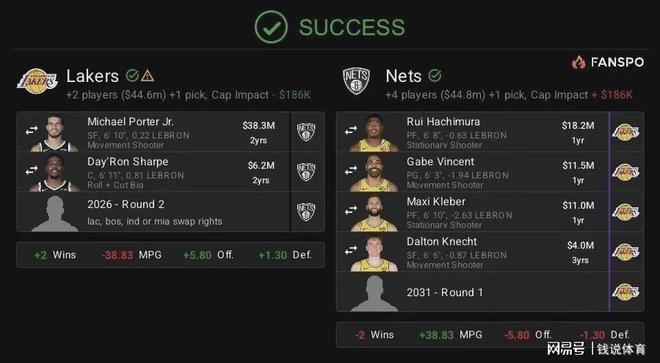 近日,美國媒體《Fansided》提出了一套令人矚目的五換三交易方案,迅速在全美球迷中引發(fā)熱議。該方案建議洛杉磯湖人將八村壘、文森特、克萊伯、克內(nèi)克特以及2031年的首輪簽送至布魯克林籃網(wǎng),以換取小波特、夏普以及2026年的次輪簽。