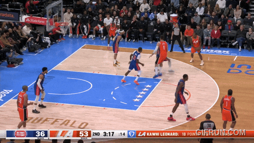 今天開場,萊納德一個三分球后,就是一個單側(cè)清空,突破罰球線強拔;隨后是找洛佩斯擋拆,突破空曠禁區(qū)襲籃。