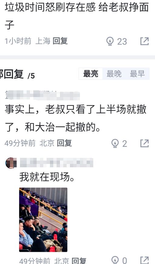 賽后有球迷給出了這樣的評(píng)價(jià):垃圾時(shí)間怒刷存在感,給老叔掙面子;隨后有現(xiàn)場(chǎng)球迷在這條評(píng)論下方回復(fù):事實(shí)上,老叔只看了上半場(chǎng)就撤了,和大郅一起撤的。并且還附帶了現(xiàn)場(chǎng)拍的照片,說(shuō)明這一場(chǎng)廖三寧表現(xiàn)確實(shí)太差,就連郭士強(qiáng)都沒眼看了。