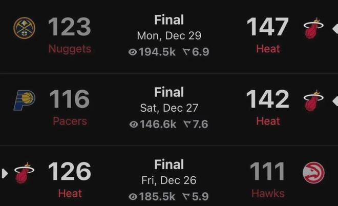 講下勝利者熱火,一直以防守強硬聞名的他們,本賽季玩起了進攻流,打掘金147分,上一場VS步行者142分進賬,連續(xù)兩場得分140+,非常極其瘋狂。
