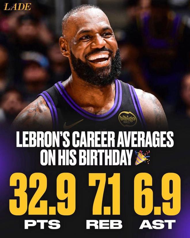 詹姆斯正式年滿41周歲,作為現(xiàn)役最老的球員依然肩負(fù)率領(lǐng)湖人前進(jìn)的重任。在詹姆斯生涯前10次NBA生日之戰(zhàn),他場均得到32.9分成為NBA生日夜場均得分最高的球員,力壓威爾金斯場均32.7分與庫里、奧尼爾場均29.4分。