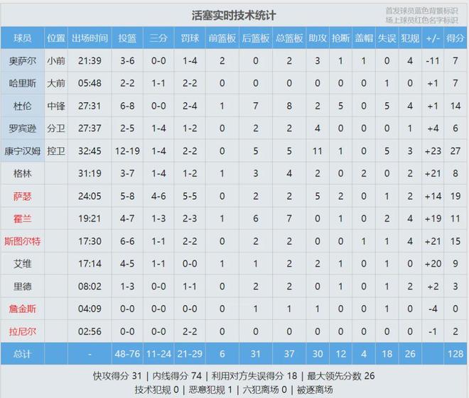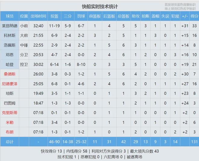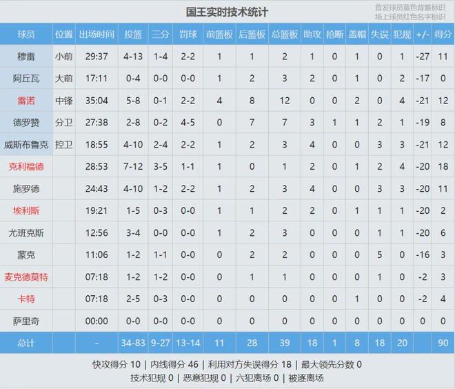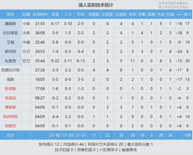 東契奇投籃22中9,三分11中3,罰球13中9,得到30分5板11助8失誤,正負(fù)值-15,末節(jié)0分。詹姆斯17投6中,三分10中3,罰球5中2,得到17分4板4助1斷1帽5失誤,正負(fù)值-16,下半場僅得2分?;钊矊幇部诚?7分5板11助!