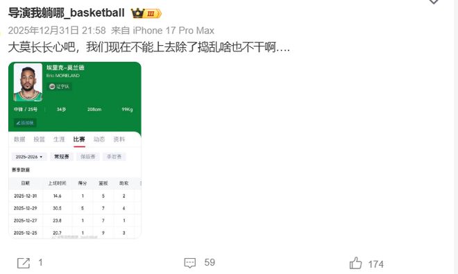 遼寧隊當(dāng)初簽回莫蘭德看中的就是他的防守,作為一個藍(lán)領(lǐng),莫蘭德攻不進(jìn)也就算了,就連自己擅長的組織策應(yīng)也做的稀碎,更別提防守,完全就是擺爛狀態(tài)。