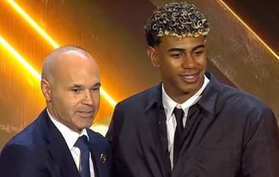 頒獎(jiǎng)典禮上,亞馬爾獲得了2025年度西甲最佳U23球員獎(jiǎng),巴薩傳奇伊涅斯塔親自為亞馬爾頒發(fā)了獎(jiǎng)杯。