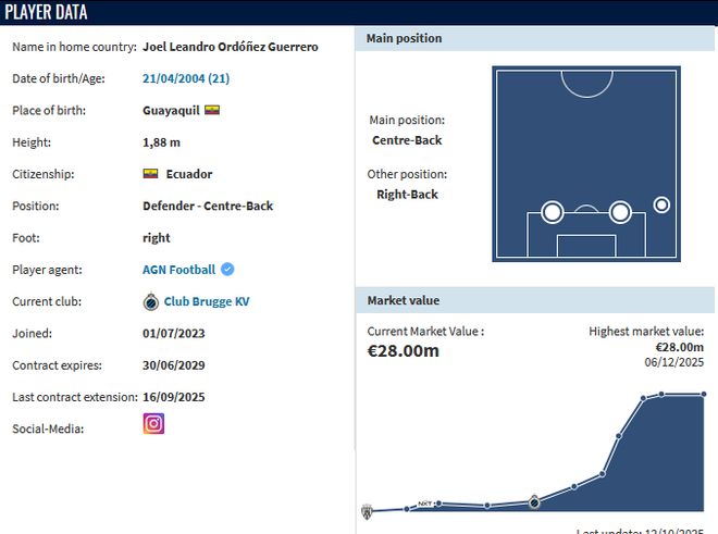 奧多涅斯,2004年出生,厄瓜多爾中衛(wèi),身高188cm+,效力于比利時(shí)聯(lián)賽布魯日,右腳球員,除了踢中衛(wèi),也客串過(guò)右后衛(wèi)。雖然說(shuō)奧多涅斯是昨晚斯蒂爾列了一堆冬窗緋聞中衛(wèi)名字里唯一不在主流聯(lián)賽里的小年輕(21),但上半年斯蒂爾寫夏窗轉(zhuǎn)會(huì)預(yù)計(jì)的時(shí)候就有提過(guò)一次,利物浦俱樂(lè)部層面派去球探到比甲布魯日觀察其實(shí)也有一個(gè)自然年了。